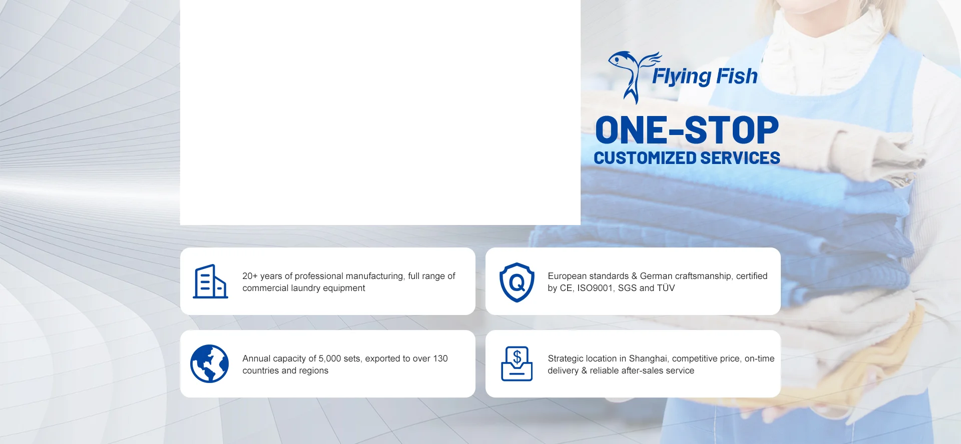 Shanghai Flying Fish Machinery Manufacturing Co., Ltd. is a leading large-scale manufacturer specializing in the integrated research, development, and production of commercial laundry and dry-cleaning equipment. Our main products include washer-extractors, tumble dryers, flatwork ironers, bed sheet folders, and integrated laundry systems. With over 20 years of industry experience and a strategic base in Shanghai, we leverage excellent multimodal transport links via sea, land, and air to serve global markets efficiently.